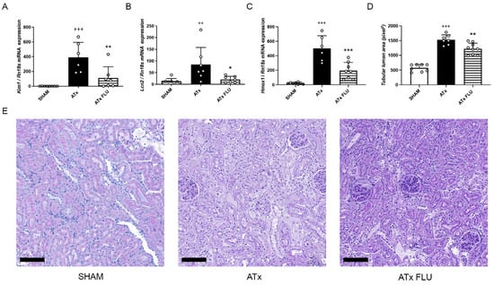 S1R agonist FLU post-transplant kidney injury. mRNA expression levels of (A) kidney injury molecule 1 (Havcr1), (B) neutrophil gelatinase associated lipocalin (Lcn2), and (C) heme oxygenase 1 (Hmox1) genes. (D) Mean area of proximal tubular lumen (pixel). (E) Representative images of periodic acid-Schiff-stained rat kidney sections (scale bar = 100 µm). ++ p < 0.01; +++ p < 0.001 vs. SHAM, * p < 0.05; ** p < 0.01; *** p < 0.001 vs. ATx, n = 6–8/group.