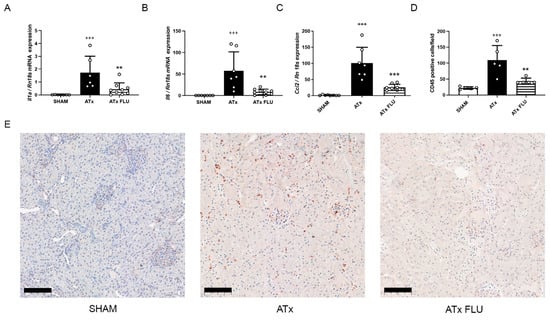 S1R agonist FLU alleviates inflammation in the kidney following ATx. mRNA expression levels of (A) interleukin 1 alpha (Il1a), (B) interleukin 6 (Il6), and (C) monocyte chemoattractant protein 1 (Ccl2). (D) Mean number of CD45 positive cells/field of view. (E) Representative images of anti-CD45 labeled rat kidney sections (scale bar = 100 µm). +++ p < 0.001 vs. SHAM, ** p < 0.01; *** p < 0.001 vs. ATx, n = 6–8/group.
