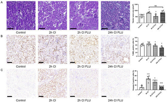 Kidneys are better preserved during cold storage with the addition of FLU to the preservation solution. (A) Mean area of proximal tubular lumen (pixel) evaluated on periodic acid-Schiff-stained rat kidney sections. (B) Mean number of apoptotic cells evaluated on rat kidney sections labeled with TUNEL assay. (C) Mean number of Caspase-3 positive cells/field of view evaluated on anti-Caspase-3 labeled rat kidney sections (scale bar = 100 µm). + p < 0.05; +++ p < 0.001 vs. Control, * p < 0.05; *** p < 0.001 vs. 2 h CI, NS. = not significant, n = 6–8/group.