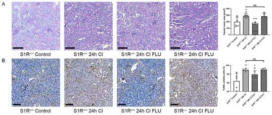 Kidneys are better preserved during cold storage with the addition of FLU to the preservation solution in S1R+/+, but not in S1R−/− mice. (A) Mean area of proximal tubular lumen (pixel) evaluated on periodic acid-Schiff-stained mouse kidney sections. (B) Mean number of apoptotic cells evaluated on mouse kidney sections labeled with TUNEL assay (scale bar = 100 µm). + p < 0.05; ++ p < 0.01 vs. Control, * p < 0.05; *** p < 0.001 vs. 2 h CI, NS. = not significant, n = 5–6/group.