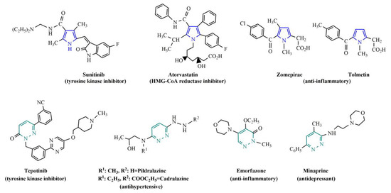 Five- and six-membered heterocyclic compounds present a special role in drug discovery design due to their remarkable biological properties [1,2,3]. From the five-membered heterocycles class, pyrroles are one of the most important compounds widespread in nature, being indispensable to life. The presence of the pyrrole nucleus in natural products (chlorophyll, heme B, bile pigments, etc.), in various drugs (e.g., sunitinib, atorvastatin, zomepirac, tolmetin) (Figure 1) and in numerous bioactive compounds with a wide spectrum of biological properties including antitumor action, is well known [4,5]. Six-membered heterocycles with pyridazine core are other natural or synthetic compounds, being a privileged scaffold in the development of new drugs, some of them being already marketed, such as tepotinib, pildralazine, cadralazine, emorfazone, minaprine (Figure 1) [6,7,8].