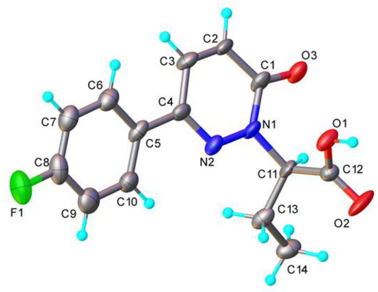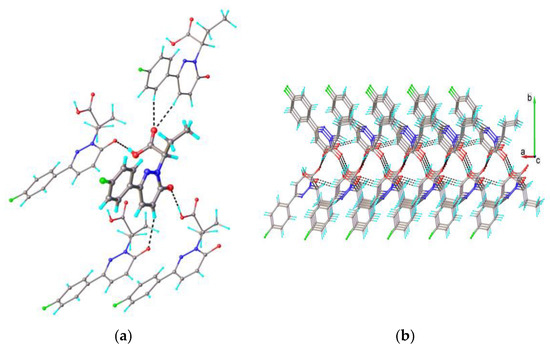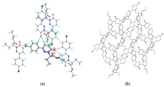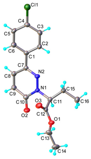 The structures of the esters 1a–c were assigned by IR and NMR spectroscopy. The 1H-NMR spectra of these intermediates present as the main feature the absence of the NH signal of pyridazine moiety and the magnetic non-equivalence of the methylene protons from the CO2Et group which appear as a multiplet instead of a quartet due to the presence of the chiral carbon center in their molecule. The hydrogen atoms H-4 and H-5 from the pyridazinone core appear as two doublets with a coupling constant of 9.6 Hz, as expected. In the 13C-NMR spectra, the two types of carbonyl groups appear at δ between 159.7–160.1 ppm for the pyridazine moiety and 169.5–169.7 ppm for the ester group. The carbon signals of methyl from CO2C2H5 and -CHC2H5 groups appeared at 14 ppm and 10 ppm, respectively. Also, the -CH< chiral carbon signal is highlighted at 62.5 ppm while the methylene carbons from ester and alkyl groups resonated at 61.5 ppm and 23 ppm, respectively. The other carbon signals appeared at the corresponding chemical shifts. The most relevant absorption bands in the IR spectra are those corresponding to the stretching vibrations of the carbonyl group from lactam (νC=O = 1655–1665 cm−1) or ester (νC=O = 1734–1738 cm−1). The structure of the ester 1c was confirmed by single crystal X-ray analysis, which has shown the compound to have a crystal structure comprising one molecular unit (Figure 2) and no co-crystallized interstitial molecules in the asymmetric part. The aromatic fragment is slightly non-planar with the dihedral angles between two rings of 18.13(8)°. Further analysis of the crystal packing has revealed the presence of short C-H···O and C-O···Cl contacts, which can be interpreted as intermolecular hydrogen and halogen bonding, respectively. As supramolecular aspects (Figure 3a) these contacts provide the direct interaction of each asymmetric unit with four adjacent molecules in the crystal. As a result, the crystal packing is characterized as a quite dense and complex three-dimensional network, as shown in Figure 3b.