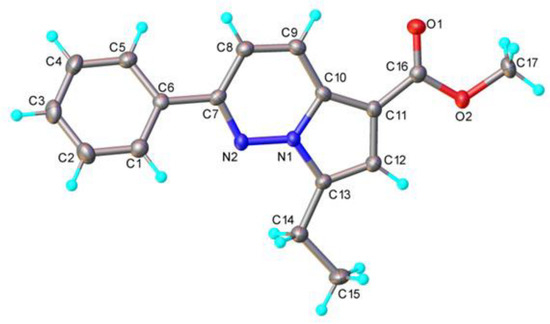 The 1H-NMR data confirm the proposed regioselectivity of 3 + 2 cycloaddition, the ester groups of cycloadducts being in the 5 position of the pyrrolo[1,2-b]pyridazine ring. In diluted solutions, the pyrrolic proton H-6 appears as a triplet due to the coupling with methylenic protons of the ethyl group in the 7 position (JH6-CH2~0.9 Hz). The multiplicity of pyrrolic proton indicated that the only possible position for the hydrogen atom is in the 6 position of the pyrrolopyridazine ring. In the case when the cycloaddition had reversed regiochemistry, the pyrrolic proton would be in the 5 position and the coupling would not occur. Also, the absence in the spectra of these new compounds of the CH proton signals from the butanoic acid fragment in the intermediate acids (5.53–5.66 ppm) confirms the cycloaddition reaction. The 13C-NMR spectra present the expected signals, the main feature being the chemical shifts attributed to the carbonyl carbon of the ester groups which are in the range 164.5–165.1 ppm. The signal for C-6 from the pyrrole ring chemical has chemical shifts of 112.6–112.8 ppm. Compared to the precursor acids, the IR spectra of pyrrolopyridazines reveal a single absorption band, in the region 1688–1666 cm−1, due to the stretching vibration of the C=O ester group.