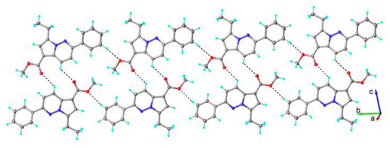 According to X-ray crystallography, compound 5a crystallizes in the P-1 space group of the triclinic system with two chemically identic, but crystallographic independent molecules (denoted as A and B) in the asymmetric part of the unit cell. As an example, the structure of molecule A is depicted in Figure 6. Similar to compounds 1c and 2b the aromatic fragment in two independent molecules A and B is also non-planar with the dihedral angle of 26.82(6)° and 16.42(6)°, respectively. It is to note, that the main crystal packing motif is determined by a system of C-H···O hydrogen bonding and essentially arises from the parallel packing of a one-dimensional supramolecular array running along the b axis, as depicted in Figure 7.