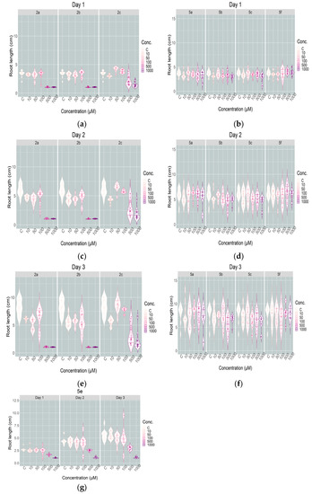 Violin plots showing the variations in Triticum’s main rootlet length under the influence of the tested compounds at different concentration levels and day of measurement: (a) day 1—acids 2a–b; (b) day 1—pyrrolo[1,2-b]pyridazines 5a–c and 5f; (c) day 2—acids 2a–c; (d) day 2—pyrrolo[1,2-b]pyridazines 5a–c and 5f; (e) day 3—acids 2a–c; (f) day 3—pyrrolo[1,2-b]pyridazines 5a–c and 5f; (g) day 1, 2 and 3—pyrrolo[1,2-b]pyridazines 5e.