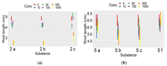 The IC50 values for those four compounds for which they could be estimated (monotonic concentration-dependent root length) are shown in Table 2. Based on the IC50 value, 2b was the most phytotoxic (although the difference is small as compared with 2a), whereas 5e was the least phytotoxic. However, 5a–c and 5f seemed even less phytotoxic (IC50 values could not be estimated for the latter, because of the absence of a monotonic relationship between concentration and root length—Figure 8).