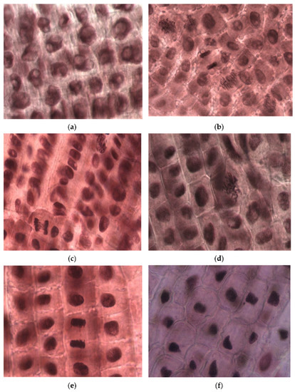 (a) Mitoinhibition and cells with 1-3 nucleoli observed in rootlets treated with 2b (1000 µM); (b) telophase in tropokinesis, normal, or disorganized metaphase (5b, 1000 µM); (c) bridged telophase, disorganized metaphase (5a, 100 µM); (d) disorganized metaphase (2c, 1000 µM); (e) telophase with delayed chromosome, wavy cell walls (5a, 1000 µM); (f) undulated cell walls and modified shaped nuclei (5e, 1000 µM). All microphotographs were taken with a lens magnified by 40×.