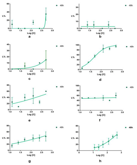 The lethality curves obtained after 48 h exposure of Daphnia magna to testing compounds. (a)—2a; (b)—2b; (c)—2c; (d)—5a; (e)—5b; (f)—5c; (g)—5e; (h)—5f; error bars represent the SD of two replicates.