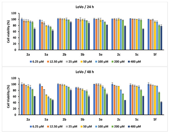 When the treatment time of LoVo cells was prolonged to 48 h, the cytotoxic effects of the new compounds were increased. Concentrations of 50 μM and 100 μM of compound 5a induced a decrease in cell viability to 65.35% and 58.18%, respectively, much lower than its precursor 2a. When concentrations of 5a were increased, the percentages of cell viability decreased more, to 52.48% for 200 μM, and 48.47% for 400 μM, compared to 2a, which for the same concentrations achieved the cell viability of 82.88% and 60.76%, respectively. The same effect was observed for the derivatives 5b and 5e that demonstrated stronger anticancer effects than their precursor, 2b: when 100 μM of 5b were used, the cell viability percentages decreased to 79.44%. When the treatment of 400 μM was applied, a stronger inhibition of cell viability was observed, to 60.33% for 5b, and 67.38% for 5e, compared to 81.11% cell viability induced by the precursor 2b.