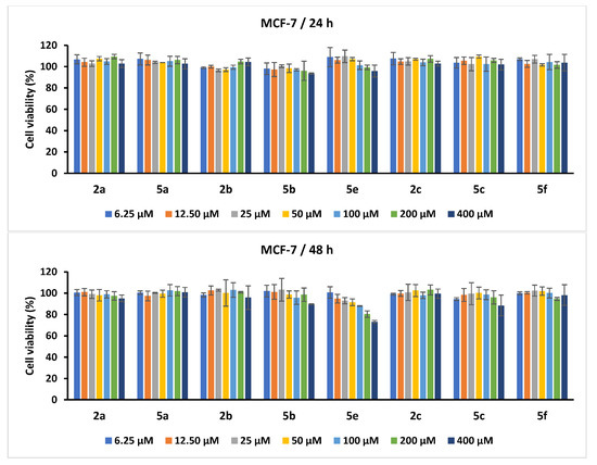 When treatments with the compounds under study were applied in MCF-7 cell cultures, much lower inhibition of cell growth was observed, as compared to LoVo cells, both for 24 h and 48 h (Figure 13). A low anti-tumor effect measured through the cytotoxic activity was observed for 2a and 5f: when cells were treated for 48 h with 200 μM and 400 μM the cell viability percentages were between 97% and 94%, respectively, for both compounds. When treatment time was prolonged to 48 h, the cytotoxic effects of several compounds were amplified. The compound 5e used in concentrations between 100–400 μM induced a decrease in cell viability of less than 90%. The strongest cytotoxic activity was obtained when cells were treated with 400 μM of the derivatives 5b, 5e, and 5c, the treatments inducing a decrease in cells viability under to 89.7%, 73.13%, and 88.53%, respectively (Figure 13).