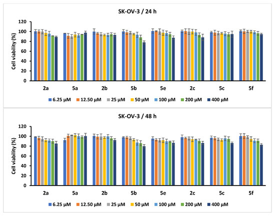 When the SK-OV-3 cells were subjected to treatments with the new compounds, the same low anti-proliferative and drug resistance profile was observed as in the MCF-7 cell line, both for 24 h and 48 h. However, when cells were treated for 24 h with 100 μM, the cell viability percentages decreased to 95% or less. The increase in the concentrations to 200 μM and 400 μM induced a higher inhibition of ovary cell growth. The strongest effect was observed following 2a, 5b, 5e, and 2c treatments with 400 μM that decreased the cell viability to 89.33%, 77.96%, 87.46%, and 88.30%, respectively (Figure 14).