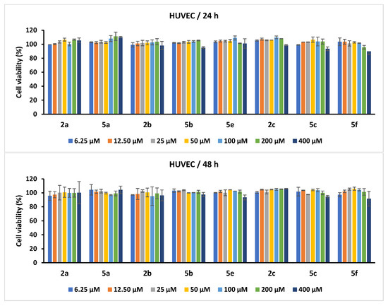 The normal HUVEC, used as reference cells of the assays, were treated for 24 h and 48 h with all the compounds under study, in the same experimental conditions as those performed on the cancer cell lines derived from various human solid adenocarcinomas. Treatments of HUVEC cells for 24 h with scalar concentrations of new compounds had no influence on cell growth or demonstrated low cytotoxicity, except 5f when cells were treated by 400 μM and the cell viability percentages diminished to 90% (Figure 15). Even when the treatment time was prolonged till 48 h, the inhibition of cell growth did not increase, 400 μM of 5f inducing a decrease in the cell viability to 91.57% (Figure 15). Therefore, the endothelial cells seemed not to be much affected by compound treatments, even used at high concentrations or prolonged time (Figure 15).