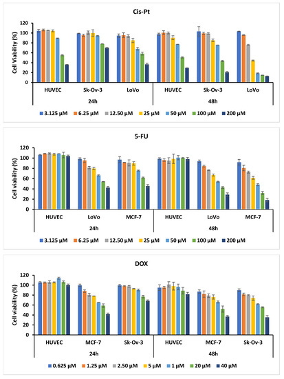 In addition, several specific oncolytic drugs, currently used in clinical treatments of solid tumors, were used throughout all the assays as positive controls. The percentages of cell viability decreased with the increase in the drug concentration, both for 24 h and 48 h treatments with 5-FU, CisPt, or DOX.