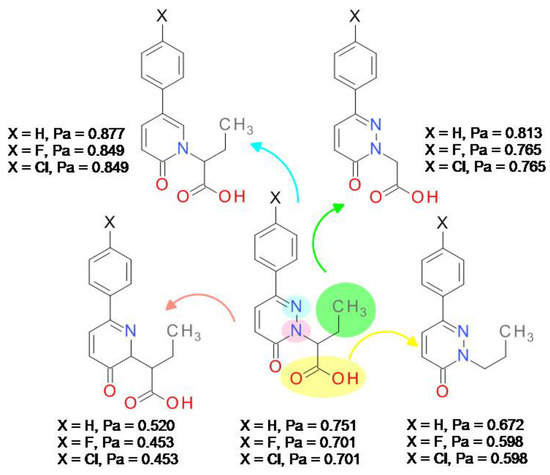 We performed a series of theoretical structure modifications on the pyridazinone scaffold in order to observe the impact of various structural features on the compound’s potential to inhibit the proteasomal ATPase. The structures and the results are presented as Pa values in the following figure (Figure 17).
