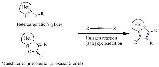 Regarding the synthesis of pyrroles and condensed pyrroles, the 1,3-dipolar cycloaddition reactions of heteroaromatic N-ylides [27,28,29] or mesoionic 1,3-oxazole-5-ones (münchnone) [30,31] with various acetylene or olefinic dipolarophiles proved to be a very useful method (Scheme 1). The cycloaddition reactions of the mesoionic münchnones is a chosen method in the synthesis of the compounds from these classes, this procedure has been applied by Dumitrascu et al. [32,33] for a new synthesis of pyrrolo[1,2-b]pyridazine derivatives, starting from 3(2H)pyridazinone acids. The pyridazinone skeleton is also present in many compounds with significant biological activities including anticancer, anti-inflammatory, analgesic, antimicrobial, antidiabetic, anticonvulsant, anxiolytic, antidepressant, antihypertensive [7,8,34,35,36,37], and optical properties [38,39].