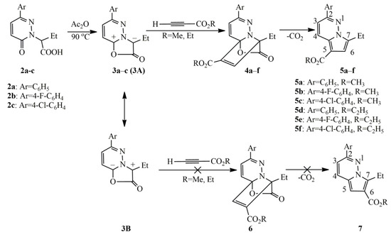 The reaction mechanism of the obtaining of new pyrrolo[1,2-b]pyridazines 5a–f implies in the first step the formation of mesoionic compounds 3 from acids 2. The mesoionics 3 react as 1,3-dipoles 3A with acetylenic dipolarophiles giving tricyclic intermediates 4 which, in the reaction conditions, eliminate carbon dioxide resulting in the corresponding pyrrolo[1,2-b]pyridazines having the ester group in the 5 position. The formation of the regioisomeric pyrrolo[1,2-b]pyridazines 7 from mesomeric form 3B and intermediates 6 was not observed by NMR analysis of the crude reaction product. The regioselectivity of cycloaddition reaction and structures of the new compounds 5a–f were assigned by NMR and IR spectroscopy and confirmed by X-ray diffraction for the representative compound 5a.