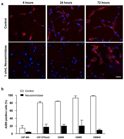 Immunofluorescence detection of A2B5 (red) expression on U87-ST8Sia3 cells before and after neuraminidase administration at 6, 24 and 72 h. Hoechst staining of the cell nuclei (blue) is also shown. Scale bar = 10 μm (a). Quantification of A2B5 expressing by flow cytometry in GBM cell lines treated with neuraminidase or vehicle (control) for 24 h (b).
