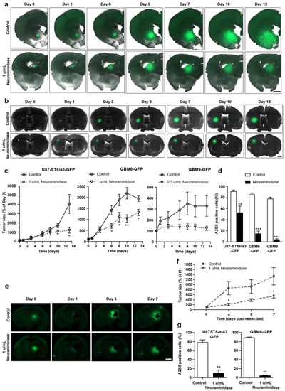 In addition, we also used this organotypic slice model to mimic tumor resection and explore whether the administration of neuraminidase affected tumor regrowth. When neuraminidase was added after the surgical removal of the tumors generated by U87-ST8sia3-GFP or GBM6-GFP spheroids, we observed the impairment of tumor regrowth compared to control (−59.1% ± 6.2 at day 7 post-tumor resection) (Figure 2e,f). This decrease in tumor size was associated with a reduction in A2B5 expression compared to control, with a number of A2B5-expressing cells of 78.0% ± 5.6 in U87-ST8Sia3-GFP and 88.5% ± 1.3 in GBM6-GFP tumors from control slices and 9.9% ± 6.8 and 3.1% ± 0.7 after neuraminidase administration (Figure 2g).