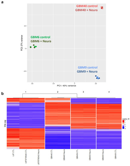 In order to search for a transcriptomic signature induced by neuraminidase administration, we performed RNA-seq from GBM6, GBM9 and GBM40 CSC lines before and after 24 h of neuraminidase administration. We observed that, when performing principal component analysis (PCA) on all the native and treated CSC lines, samples were grouped together by cell lineage (Figure 3a), and when performing PCA on each CSC line separately (native and treated samples), samples were grouped slightly together by batch. Moreover, each CSC line shared with its neuraminidase-treated counterpart almost the same transcriptomic signature; therefore, this approach did not allow the identification of a distinct transcriptomic signature induced by neuraminidase administration.