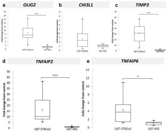 Validation by RT-qPCR of selected genes in U87-ST8Sia3 vs. U87-MG cell lines: OLIG2 (a), CHI3L1 (b), TIMP3 (c), TNFAIP2 (d), and TNFAIP6 (e). Results are shown as fold change from control with box plots. The lower and upper edges of the box represent the first and third quartile respectively, while a horizontal line within the box indicates the median and the red cross the mean. The vertical length of the box represents the Interquartil range (IQR). The most extreme sample values (within a distance of 1.5 IQR from the median) are the endpoints of the lines extending from the box, while the blue circles represent the outliers (1.5 IQR above 75th percentile) and far outliers (3 IQR above 75th percentile) respectively. *** p < 0.001, * p < 0.05.