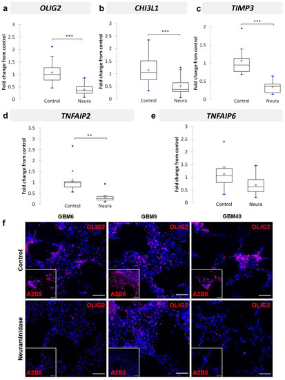 Validation by RT-qPCR of selected genes in CSC (GBM6, GBM9, GBM40, with or without neuraminidase (Neura) administration): OLIG2 (a), CHI3L1 (b), TIMP3 (c), TNFAIP2 (d), and TNFAIP6 (e). Results are shown as fold change from control with box plots. The lower and upper edges of the box represent the first and third quartile respectively, while a horizontal line within the box indicates the median and the red cross the mean. The vertical length of the box represents the Interquartil range (IQR). The most extreme sample values (within a distance of 1.5 IQR from the median) are the endpoints of the lines extending from the box, while the black circles and the blue circles represent the outliers (1.5 IQR above 75th percentile) and far outliers (3 IQR above 75th percentile) respectively. Immunofluorescence detection of OLIG2 protein (f) in GBM6, GBM9 and GBM40 CSC lines in control cells (top panel) or after 24 h neuraminidase administration at EC50 (bottom panel). The small square shows the loss of A2B5 immunostaining after neuraminidase administration. Scale bar = 100 μm. *** p < 0.001, ** p < 0.01.