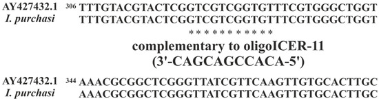 Alignment of the sequenced DNA fragments of I. purchasi (collected from nature) and I. purchasi 28S large subunit ribosomal RNA gene (from GenBank) fragments performed using ClustalW 2.0.3; complementary to oligoICER-11 sequences are marked with *.