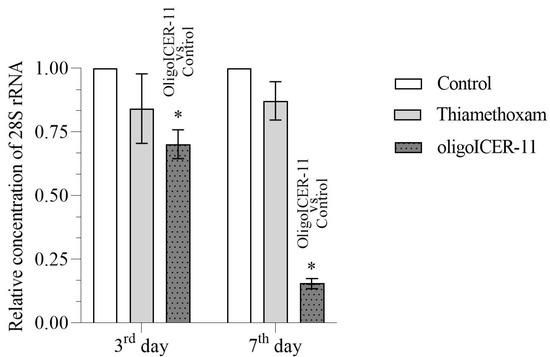 We evaluated the specificity of action of the olinscide oligoICER-11 by analyzing the expression of 28S rRNA. A decrease in the expression of action of the target gene is the gold standard for proof of specificity of action [41] for antisense oligonucleotides. The concentration of the 28S rRNA in oligoICER-11-treated insects was lower (1.4-fold) compared with that of the controls on the third day, and significantly lower (6.4-fold) compared with that of the controls on the seventh, as shown in Figure 3.