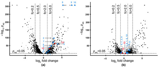 Volcano plots of gene expression for RM (a) and SYM (b) media. Genes that significantly changed their expression levels on both media are highlighted in black. 1, Locus tag IEQ11_03495 (UOF15745.1); 2, IEQ11_04180 (UOF15870.1); 3, IEQ11_06885 (UOF16369.1); 4, IEQ11_09745 (UOF16892.1); 5, IEQ11_12530 (UOF17397.1); 6, IEQ11_14225 (UOF12917.1); 7, IEQ11_15570 (UOF13168.1); 8, IEQ11_15580 (UOF13170.1); 9, IEQ11_17420 (UOF13513.1); 10, IEQ11_22400 (UOF14439.1); 11, IEQ11_23755 (UOF14691.1); 12, IEQ11_08595 (UOF16681.1); 13, IEQ11_14490 (UOF12968.1). Blue and red triangles, the genes of interest. Red triangles, the genes chosen to be studied.