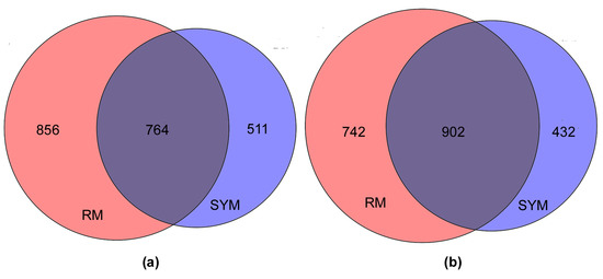 Area-proportional Venn diagrams showing the number of DEGs that overlapped between RM (red) and SYM (blue) media. The diagrams show the number of induced (a) and repressed (b) genes, respectively.
