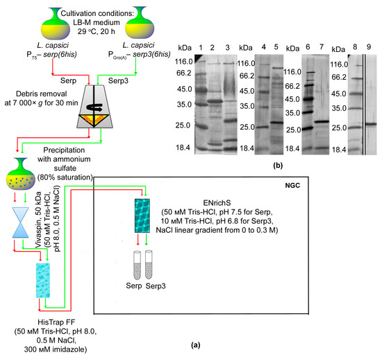 Purification of bacteriolytic enzymes Serp and Serp3 from the culture fluid of L. capsici expression strains. (a) Serp and Serp3 purification schemes. Red arrows indicate the Serp purification scheme; green arrows indicate the Serp3 purification scheme. (b) SDS-PAGE: 1, 4, 6 and 8, markers; 2, the culture fluid of wild-type L. capsici (Supplementary File S1 Figure S5); 3, the culture fluid of L. capsici PGro(A)–serp3(6his) (Supplementary File S1 Figure S5); 5, the culture fluid of L. capsici PT5–serp(6his) (Supplementary File S1 Figure S6); 7, purified Serp3 of L. capsici PGro(A)–serp3(6his) (0.18 μg) (Supplementary File S1 Figure S7); 9, purified Serp of L. capsici PT5–serp (0.35 μg) (Supplementary File S1 Figure S8). A 12 μL amount of the preparations was applied to the electrophoresis.