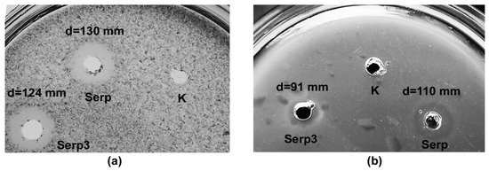 The specific proteolytic activities of Serp and Serp3 were 2.17 ± 0.23 and 5.98 ± 0.90 PE/mg, respectively. This confirms that the newly discovered enzymes are bacteriolytic proteases, which, in addition to bacterial cell walls, can hydrolyze protein substrates. The specificity of action of Serp and Serp3 with respect to casein, azofibrin, hemoglobin, gelatin, elastin, and collagen was studied by the spot test method (Table 4, Figure 6).