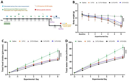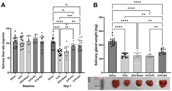 - Pilocarpine—positive control group: 5−FU injection and 1 mg/10 mL/kg pilocarpine (Sigma-Aldrich, St. Louis, MO, USA) given orally twice per day on the same days as EA sessions (5−FU + Pil); the dose was chosen based on a published study [52], and other groups were instead given distilled water. The use of pilocarpine as an effective prophylactic and treatment medication for xerostomia was reported in the previous study [53].