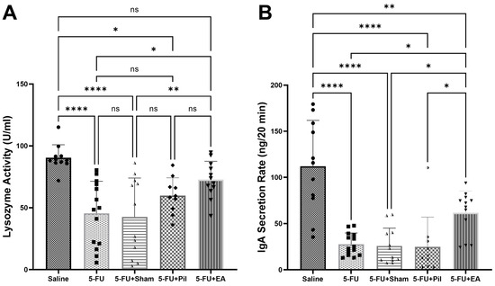 2.4. EA Diminished the Decrease in Salivary IgA Secretion Rates and Lysozyme Activity Caused by 5−FU