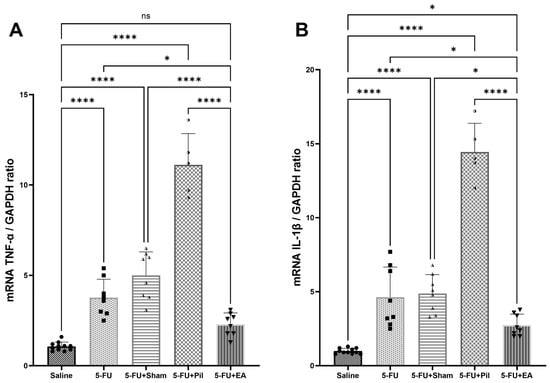 2.5. EA Attenuated the 5−FU-Induced Pro-Inflammatory Cytokines (Tumor Necrosis Factor-α and Interleukin-1β) Expressions in the Salivary Gland