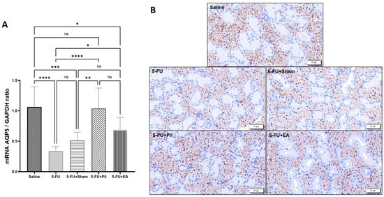 2.6. Pilocarpine and EA Treatment Reversed the Decrease in AQP5 mRNA Expression Induced by 5−FU in the Salivary Glands
