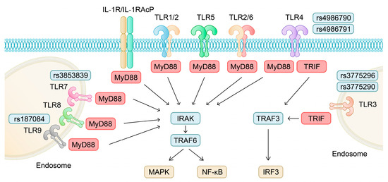 Schematic illustration of the TLR signalling pathways with highlighted gene polymorphisms involved in OA susceptibility. IRAK—interleukin-1 receptor-associated kinase; MyD88—myeloid differentiation primary response 88; TLR—Toll-like receptor; TRAF–TNF receptor-associated factor; TRIF–TIR-domain-containing adaptor-inducing interferon B.