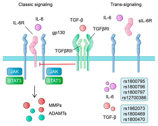 Schematic and simplified IL-6 signalling pathway, its impact on OA-related metalloproteinases and selected polymorphisms associated with OA development or protection. ADAMTS—a disintegrin and metalloproteinase with thrombospondin motifs; IL-6—Interleukin-6; JAK—Janus kinase; MMP—matrix metalloproteinase; STAT3—signal transducer and activator of transcription 3; TGF-β—transforming growth factor β.
