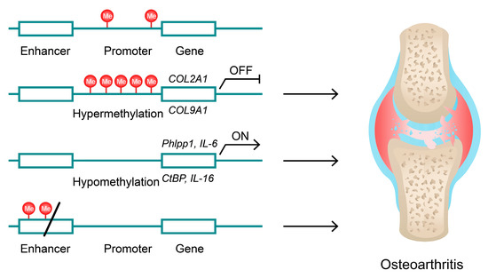 Epigenetic modifications involve processes associated with the regulation of gene expression, such as DNA methylation, histone modifications or chromatin remodelling [167]. Furthermore, RNA epigenetics also largely contributes to the regulation of gene expression [168]. To begin with, methylation of CpG islands is considered a major epigenetic regulation and is involved in processes such as aging and carcinogenesis [169,170]. Depending on the region, CpG methylation may either promote or repress gene expression [171]. Recent studies revealed that DNA methylation is one of the factors contributing to the pathogenesis of OA and its pro-inflammatory character. Firstly, comparison of the OA animal model with controls reveals differences in the methylation rates of selected genes [172]. Furthermore, C-terminal-binding proteins (CtBP1 and CtBP2) act as corepressors of transcription, the levels of which are elevated in patients with OA [173,174]. Sun and colleagues demonstrated that methylation of the CpG island in the promoters of CtBP genes was decreased in OA patients, thus apparently being associated with elevated CtBP proteins and their subsequent signalling [174]. Furthermore, hypomethylation of IL-16 in the OA cohort has been identified, which led to its elevated concentrations in serum. As a result, IL-16 can promote the production of pro-inflammatory mediators, such as IL-6 or TNFα [175]. Protein phosphatase Phlpp1 represents another enzyme that is elevated in OA tissues and has decreased CpG promoter methylation [176]. Similarly, the promoter region of IL-6, which is enriched in CpG sites, is hypomethylated in SF from OA patients. Accordingly, these regions are also associated with decreased binding of Dnmt1 and Dnmt3a [177]. Interestingly, a recent study demonstrated that the depletion of STAT3 in foetal chondrocytes results in the DNA hypermethylation of genes related to aging, proliferation, or development of the ECM, among others. The authors suggest that STAT3 might act through the DNA methyltransferase 3 beta (DNMT3B). The knockdown of STAT3 was associated with progressed OA in post-traumatic animal models [178]. Additionally, Izda and colleagues showed that aging and OA in murine models generated through destabilisation of the medial meniscus share some similarities in DNA methylation, which shows that aging might contribute to the development of OA on an epigenetic level [179]. Zhang et al. revealed that human chondrocytes stimulated with triclocarban showed elevated methylation in the COL2A1 gene (type II collagen), which suppressed its expression and reduced cartilage tissue [180]. Moreover, COL9A1 (collagen type IX) promoter is hypermethylated, which results in a decrease in respective mRNA molecule levels in OA [181]. Importantly, the evaluation of a DNA methylation pattern might be used to monitor the progression of OA [182]. Moreover, recent studies have found numerous differently methylated CpGs in enhancer regions [183,184]. Interestingly, the analyses of DNA methylation may help in understanding the precise role of genetic susceptibility. Polymorphisms associated with changes in gene expression may change DNA methylation status. For instance, Kehayova et al. revealed an allelic expression imbalance between C and T alleles in heterozygous hip or knee OA patients. Compared with allele T, allele C of rs583641 was associated with an elevated expression of COLGALT2 and a reduced DNA methylation of gene enhancer [185]. Therefore, hypomethylation of gene promoters encoding pro-inflammatory proteins, as well as hypermethylation of the genes associated with cartilage quiescence and structure may contribute to the pathogenesis of OA (Figure 4).