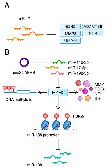 (A) A chondroprotective role of miR-17 [225]; (B) The various functions and interactions of EZH2, a histone methyltransferase, which methylates H3K27 [212] and promotes OA-related markers and catabolic factors in stimulated chondrocytes [213]. EZH2 is involved into the regulatory network with other epigenetic mechanisms, such as DNA methylation [216], and it is a target of several micro RNAs [229,230]. ADAMTS—a disintegrin and metalloprotease with thrombospondin type I motifs; EZH2—enhancer of zeste homolog 2; MMP—matrix metalloproteinase; NO—nitric oxide; PGE2—prostaglandin E2.