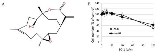 (A) Chemical structure of SC-1 (SC-1). (B) A549 and HepG2 cells were treated with various dosages of SC-1 (ranging from 1 μM to 40 μM) for duration of 48 h, as indicated. The viability of cells was determined using the CCK8 assay. The data are representative of three independent experiments with mean ± SD (n = 3/group).