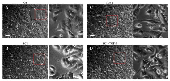 Effects of SC-1 and TGFβ in cell morphology. A549 cells were treated with (A) control (DMSO), (B) 40 μM SC-1, (C) 200 pM TGF-β, and (D) 200 pM TGF-β containing 40 μM SC-1 for 24 h. The enlarged red squares are shown in the right-side images for detailed visualization. Bar = 200 μm.