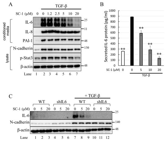 SC-1 specifically inhibited the TGFβ-stimulated IL-6 secretion in A549 cells. (A) Levels of IL-6 in the medium were determined by Western blot following incubation of A549 cells in the presence of 1.2, 2.5, 5, 10, and 20 μM SC-1 for 48 h. (B) Levels of IL-6 in the medium were detected by ELISA. Each bar represents the mean ± SD of three independent experiments. Statistical significance relative to the TGFβ group is indicated: ** p < 0.001. (C) Levels of IL-6 in the medium were detected by Western blot following incubation of A549 cells expressing control or IL-6 silencing shRNA (shIL6) in the presence or absence of SC-1.