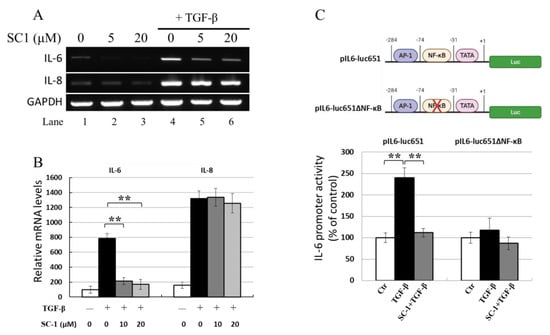 The effects of SC-1 on the TGFβ-stimulated production of IL-6 were studied using luciferase reporter gene assays. A 651 bp fragment of the human IL-6 promoter was inserted into a luciferase reporter gene vector to generate the pIL6-luc651 construct (Figure 4C). As shown in Figure 4C (lower graph), when transfected into A549 cells, TGFβ (at a concentration of 50 pM) elevated pIL6-luc651 activity to 240 ± 12% of the unstimulated control (as 100%). The addition of 20 μM SC-1 resulted in a reduction in TGFβ-mediated IL-6 promoter activity to 11% (115% versus 240%, ** p < 0.001), consistent with the dose-dependent changes observed at the mRNA and protein levels. However, in the cells expressing the reporter construct harboring NF-kB truncation (pIL6-luc651∆NF-kB) [], IL-6 promoter activity was not changed upon TGFβ treatment.