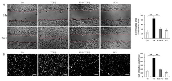 A549 cells (2 × 104) were grown in each well of a 24-well cluster plate and incubated at 37 °C with 5% CO2 overnight. A549 cells were pretreated with 20 μM SC-1 for 4 h. The cell layer was then scraped using a 200 μM pipette tip and washed to remove debris and followed by a fresh medium containing 0.5% serum. Cells were then incubated with 200 pM of TGFβ for 24 h. Cell migration was determined by measuring wound closure. Representative photographs were taken at ×200 magnification using a NIKON TE2000-U inverted microscope (Nikon, Tokyo, Japan).