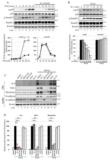 The activation of IL-6 by IL-1b or TNF-α is known to be mediated through the p38 MAPK pathway, and p38 MAPK is involved in TGFβ-induced gene expression [,,]. Therefore, we investigated whether SC-1 inhibits the non-canonical TGFβ signaling pathway through p38 MAPK in cancer cells. Figure 6A shows that TGFβ treatment significantly increased the phosphorylation of p38 MAPK and Smad2/3 in A549 cells. The time profile data in Figure 6A demonstrates that TGFβ-induced maximal phosphorylation of p38 MAPK and Smad2/3 occurred at 120 min and 60 min, respectively (lanes 6 and 4). Pretreatment with SC-1 resulted in a marked inhibition of TGFβ-induced p38 phosphorylation without affecting the total expression of p38 (Figure 6A, lane 12 versus lane 6, quantitative result in the lower graph). However, the level of TGFβ-mediated Smad2/3 phosphorylation was not changed by SC-1 treatment (Figure 6A, lane 10 versus lane 4). In addition, SC-1 inhibited TGFβ-induced p38 phosphorylation in a dose-dependent manner (Figure 6A, lane 2 to lane 7) without affecting Smad2/3 phosphorylation (quantitative result in the lower graph). This suggests that p38 MAPK plays a crucial role in IL-6 activation by TGFβ. To elicit the role of p38 in TGFβ-stimulated IL-6 production, TGFβ activation was blocked by treatment with SB431542, which inhibits TGFβ type I receptor (ALK5) kinase activity, by treatment with the p38 inhibitor SB203580, or by SC-1. As shown in Figure 6C,D (a graph of quantitative results), treatment with SB431542, SB203580, or SC-1 resulted in a strong inhibition of TGFβ-induced IL-6 expression at secreted protein levels (Figure 6A, lanes 8, 9, 10 versus lane 7). In contrast, treatment with Stattic, which inhibits STAT3 (Signal transducer and activator of transcription 3), or by MEK Inhibitor SL327 did not inhibit IL-6 production (Figure 6A, lanes 11, 12 versus lane 7).