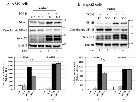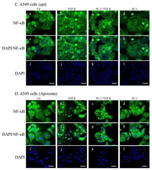 SC-1 inhibited TGF-β-induced NF-kB nuclear translocation. Nuclear translocation of NF-kB proteins was analyzed by separating nuclear fractions after the treatment of A549 (A) and HepG2 (B) cells with TGF-β or SC-1. Complete fractionation of nuclear proteins and equivalent loading were verified through Western blotting using antibodies against lamin B. Representative images with lower graphs illustrating quantitative analyses of ECL (mean ± SD) from three independent experiments (compared with TGFβ treatment alone); ** p < 0.01. In epi-fluorescent micrograph (C) and ApoTome microscopy (D), images of untreated ((Ca) and (Da)) and TGF-β-treated ((Cb) and (Db) are positive controls) A549 cells are shown in comparison with cells treated with 20 μM SC-1 and 100 pM TGF-β ((Cc) and (Dc)). Immunofluorescence staining was performed as described in the Materials and Methods section. Bar = 100 μM.