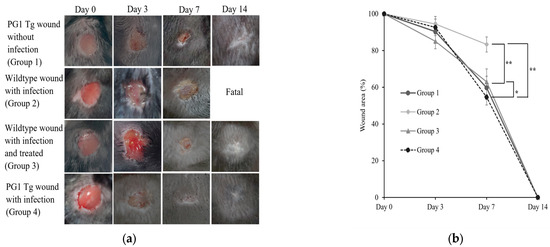 Sterile wounds were generated on the backs of wild-type and PG1 Tg mice, i.e., which express low levels of PG1 in the skin [37]. In the bacterial infection group, wounds were infected with 106 colony-forming units (CFUs) of S. aureus ATCC 6538. In the antibiotic treatment group, a single-dose gentamycin (2 μg/mL) solution was applied to the wounds every 24 h for three consecutive days. The resultant four experimental groups (n = 5/group) are as follows: Group 1, PG1 Tg mice with uninfected wounds; Group 2, wild-type mice with S. aureus-infected wounds; Group 3: wild-type mice with S. aureus-infected wounds administered to gentamycin treatment; and Group 4, PG1 Tg mice with S. aureus-infected wounds. Animal health and wounds were monitored every 12 h until the last day of the experiment (day 14). All animals in Groups 1, 2, and 4 fully recovered, with re-epithelialization on day 14. In contrast, all animals in Group 2 died between days 8 and 10 (Figure 1a). Upon visual examination, heavier pus formation was observed in the Group 2 animals than in those in the other groups, which had relatively clean wounds. Although we did not perform postmortem pathological analysis, the death of Group 2 animals was likely caused by the uncontrolled proliferation of bacteria, leading to associated inflammatory responses and sepsis.