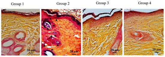 We assessed the wound biopsy sections of post-wound days 3 and 7 samples using hematoxylin and eosin (H&E) staining (Figure 2). Although experimental wound creation was carefully conducted, eschar on the reforming epithelium and remaining fragile tissues at the wound area prevented a clean morphology of the tissue sections. Histological observations showed that the reformation of the neo-epithelium was clearly identifiable in the sections of Groups 1, 3, and 4. However, this was not clear for Group 2. Representative sections of post-wound day 7 showed a more complete epithelial layer structure, distinguishing different sublayers of the epidermis, stratum corneum, stratum lucidum, and stratum granulosum in Groups 1, 3, and 4, but not in Group 2 (Figure 2). The degree of neo-epithelial layer reestablishment was similar in Groups 3 and 4 and was more complete than that in Group 1. The reformation of the neo-epithelial layer in Group 2 was less complete than that in the other experimental groups.