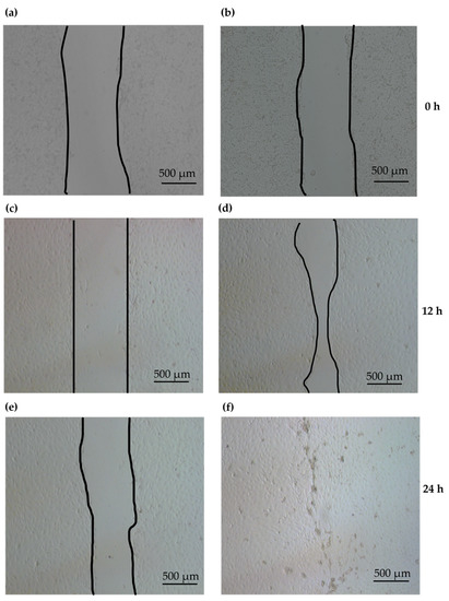 Effect of PG1 on cell scratch assay. A monolayer of cultured keratinocytes prepared from PG1 transgenic mice was scratched and treated with recombinant PG1. The culture time is indicated on the right. Panels (a,c,e) represent the untreated PG1 Tg keratinocytes, and (b,d,f) represent PG1 Tg keratinocytes treated with 8 μg/mL of PG1 at the indicated time points. Keratinocytes treated with PG1 exhibited wound repair activity in the scratched area. The edges of unfused scratch are indicated by black lines (a–e). Complete healing of the scratched area is shown in (f). Scale bar 500 μm.