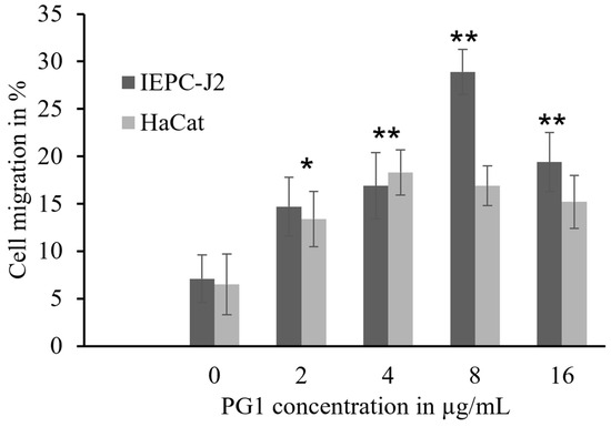KC primary cells exhibited >60% scratch repair after 12 h of PG1 treatment. This suggests that PG1 induces the migration of KCs to facilitate wound closure. However, the results also suggest that PG1 expression in PG1 Tg KC primary cells was not sufficient to induce active migration of the cells. This is consistent with the fact that the expression of PG1 in the skin of PG1 Tg mice is lower than that in other tissues [37]. Furthermore, this suggests that circulating PG1 expressed in other tissues of PG1 Tg mice might be an additional source of PG1 for KCs in the infected wound. In addition, the result of the Boyden chamber assay showed a 20% and 30% increase in the migration of human KCs (HaCaT) and intestinal porcine epithelial cells (IPEC-J2), respectively, after treatment with 4–8 μg/mL of PG1. The basal migration rate of the cells without PG1 treatment was minimal (<3%), which is consistent with the results of the scratch assay. At the highest tested concentration (16 μg/mL) of PG1 treatment, the migration rate was lower than that at 8 μg/mL for both cell lines, which can presumably be attributed to PG1 toxicity [34]. In addition, the migration rate after PG1 treatment was slightly higher in IPEC-J2 cells than that in HaCaT cells, indicating differences in migratory responses depending on the cell type (Figure 5).